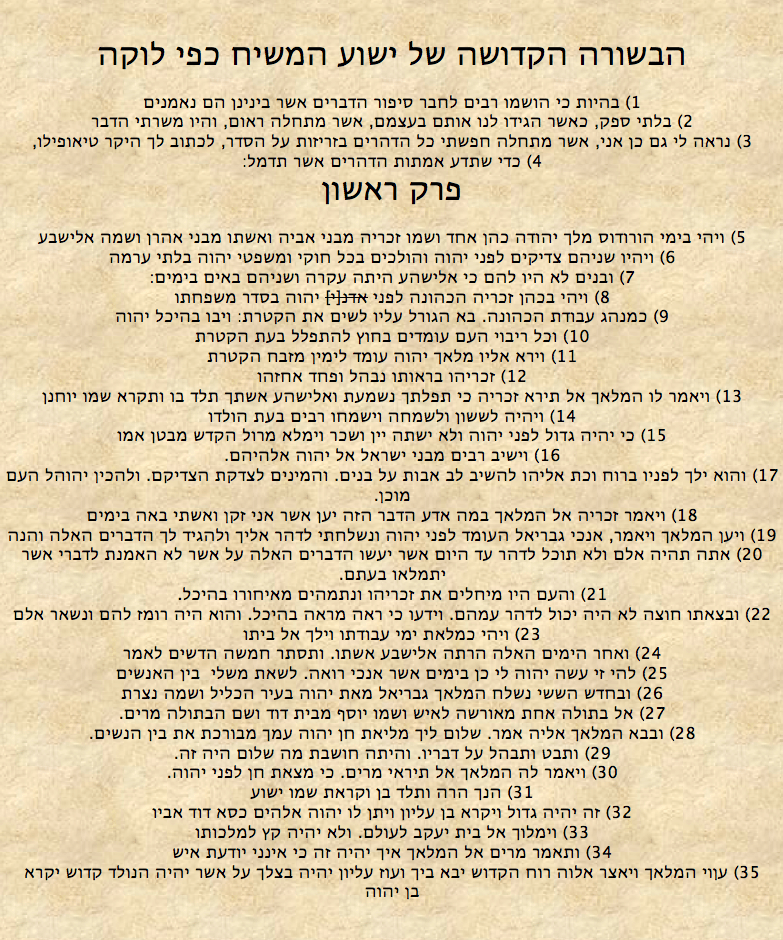 1) In that many were placed to write the account of the matters that are trustworthy among us, 2) without doubt, as they told them to us themselves, those who saw them from the beginning, and were my servants [of] the Word, 3) It seemed also right to me, because from the beginning I sought all the things in order, to write to you with speed, dear Theophilo, 4) in order that you would know the truth of the matter that you have learned. 5) And it came to pass in the days of Herod, King of Judah, a certain Kohen, his name was Zechariah from the sons of Aviyah, and his wife from the children of Aaron and her name was Elisheva. 6) And both of them were righteous before Yehovah and walking in all the statues and judgements of Yehovah, without guile, 7) and they did not have children; Elisheva was barren and both of them were advanced in years. 8) And the Kohen Zechariah had the priesthood before Adona[i] Yehovah in the order of his family, 9) according to the custom of the service of the priesthood, the lot fell upon him to present the incense. And he came into the sanctuary of Yehovah 10) and the multitudes of people were standing outside to pray at the time of the incense 11) and the angel of Yehovah appeared to him, standing at right of the altar of incense 12) and Zechariah, when he saw him, was terrified and fear seized hold of him. 13) And the angel said to him “Do not fear, Zechariah, for your prayer is heard, and Elisheva your wife will give birth to a son and you shall call his name Yochanan 14) and there shall be to you joy and happiness and many will be happy at the time of his birth, 15) for he will be great before Yehovah and will not drink wine or strong drink and he will be filled from the Ru’ach HaKodesh from the womb of his mother 16) and he will return many of the sons of Israel to Yehovah their Elohim 17) and he will walk before him in the spirit and power of Eliyahu, to return the heart of the fathers to the sons and [he will return] the heretics to the righteousness of the righteous ones and to prepare to Yehovah the people, prepared.” 18) And Zechariah said to the angel, “How will I know this matter, for I am old and my wife is advanced in years?” 19) And the angel answered and said, I am Gabriel who stands before Yehovah and I was sent to speak to you and tell you these matters and behold, 20) you will be mute and will not be able to speak until the day that these things are done, because you did not believe my words, that they would be fulfilled in their time.” 21) And the people were waiting for Zechariah and wondering because of his delay in the sanctuary. 22) And when he came out outside, he was not able to speak with them. And they knew he saw a vision in the sanctuary. And he was gesturing to them, be remained a mute. 23) And it came to pass when the days of his service were fulfilled and he went to his house 24) and after these days, Elisheva his wife became pregnant. And she hid five months saying, 25) “Why did Yehovah do this to me in the days that I see, to raise up my proverb among the people?” 26) And in the sixth month, the angel Gabriel was sent from Yehovah in a city of the Galilee, and its name was Natzaret, 27) to a certain virgin who was betrothed to a man and his name was Yoseph from the House of David and the name of the virgin was Miryam. 28) And when the angel came to her he said, “Shalom to you, full of grace, Yehovah is with you, you are blessed among women.” 29) And she looked and was frightened because of his words. And she was thinking, “What sort of ‘Shalom’ was this?” 30) And the angel said to her, “Do not fear, Miryam. For you have found favor before Yehovah. 31) Behold you are pregnant and will give birth to a son and will call his name Yeshua. 32) This one will be great and will be called Son of the Most High and Yehovah Elohim will give him the Throne of David his father 33) and he will reign over the House of Ya’akov forever. And there will be no end to his kingdom.” 34) And Miryam said to the angel, “How will this be, for I have not known a man?” 35) And the angel answered and said to her, “The Ru’ach HaKadosh will enter you and an exalted might will be in your shadow. Because he that will be born will be holy, he shall be called ‘Son of Yehovah.’”